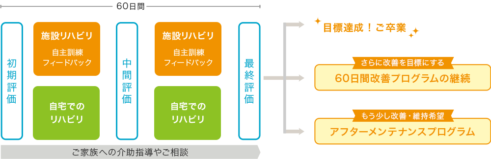 ご自宅でも体力や能力に合わせた自主訓練を実施することで、動作確認やレベルアップを目指します。